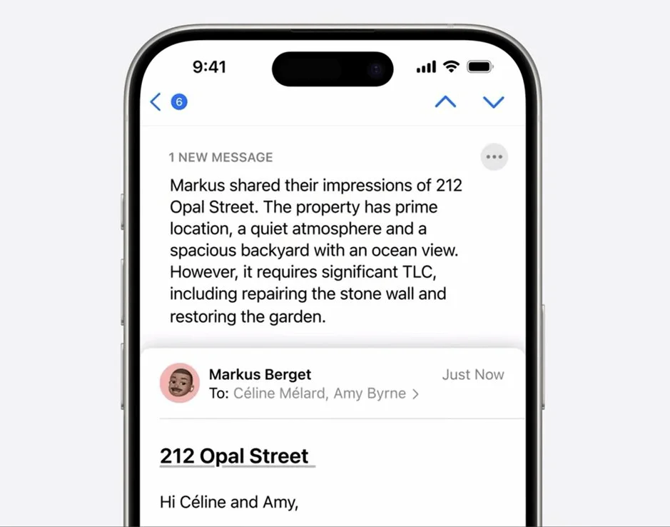 Почта Apple. С появлением Apple Intelligence почтовый клиент Apple получил два формата саммари. Перед открытием письма оно заменяет прехедер, а после открытия доступно в двух вариантах: в виде краткой сводки в одном абзаце или конспекта с маркированным списком. Apple Intelligence работает на последних моделях iPhone, начиная с 15 Pro, а также на iPad и Mac с чипом М1 и новее.