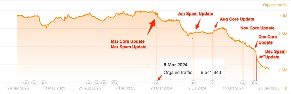 HubSpot — один из крупнейших блогов про маркетинг. Еще в марте 2023 года он собирал около 10 миллионов органических визитов в месяц. Спустя полтора года, к январю 2025, трафик упал до 2,5 миллионов.