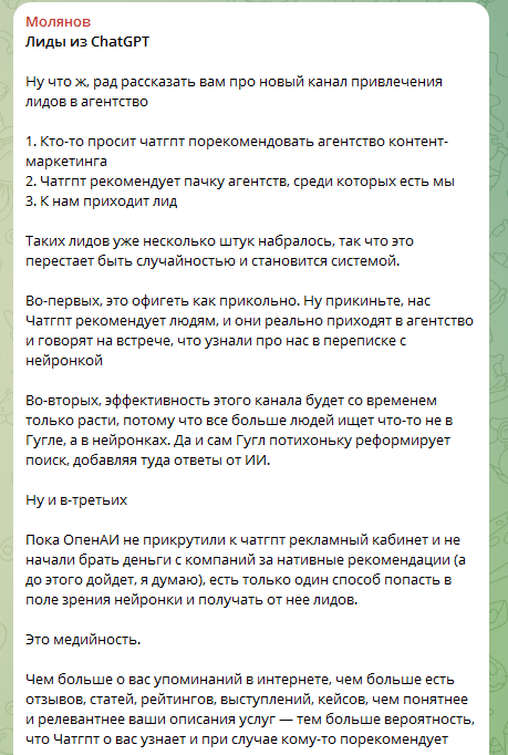 Также нужно работать с брендом и узнаваемостью. AI будет отдавать предпочтение популярным брендам, т. к. это снижает риск распространения фейков.