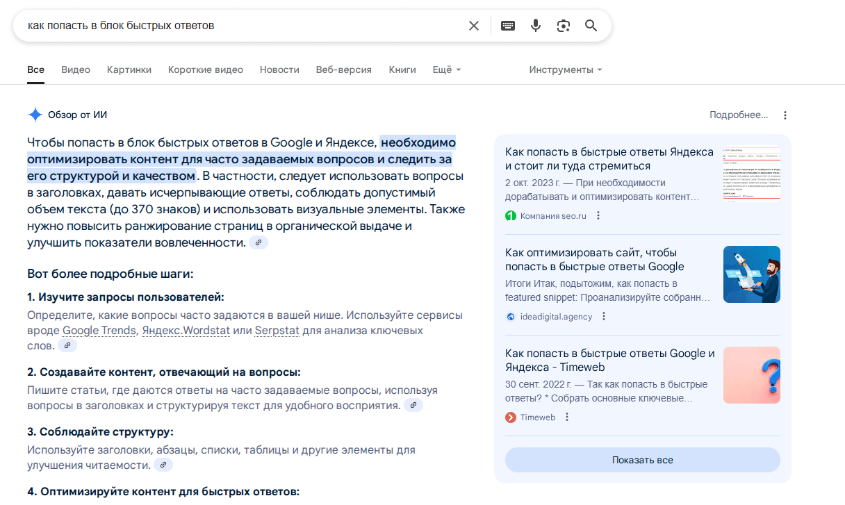 Но со временем разработчики Google поняли: люди не хотят переходить на сайты, они хотят быстро получать нужный ответ. Так появился блок быстрых ответов. По разным запросам в формате «как…», «что…» и т. д. ответ появлялся ( и иногда появляется) прямо в поиске в формате небольших карточек. Похожую функцию внедрил и Яндекс. Это повлияло на трафик: сайты, которые раньше собирали тысячи переходов на простых запросах, начали терять аудиторию. Люди получали быстрый ответ и уходили, не переходя по ссылке.
