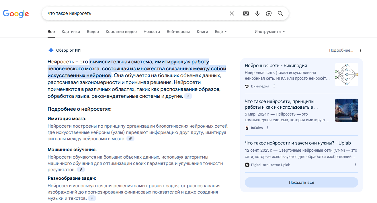 А в 2023 году Google начал тестировать новый инструмент — SGE (Search Generative Experience). Суть инструмента — не просто найти ссылку, а сгенерировать развернутый и человеческий ответ, в котором уже учтено мнение десятков источников. Весной 2024 года технология вышла из беты и появилась в США, а в 2025 — практически во всем мире. Назвали инструмент AI Overviews.