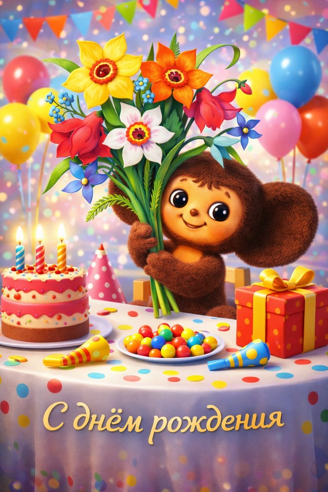 Посмотрите на популярные открытки. Герой, например Чебурашка или Стич, чаще всего находится в центре, сидит за праздничным столом или держит букет. А текст поздравления написан вокруг него, сверху или снизу.