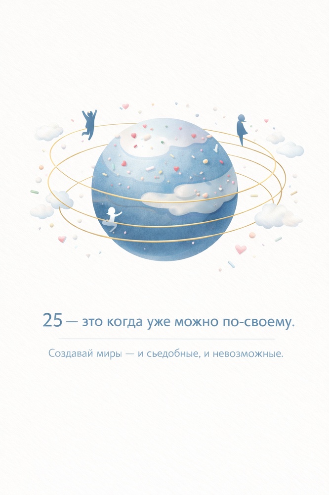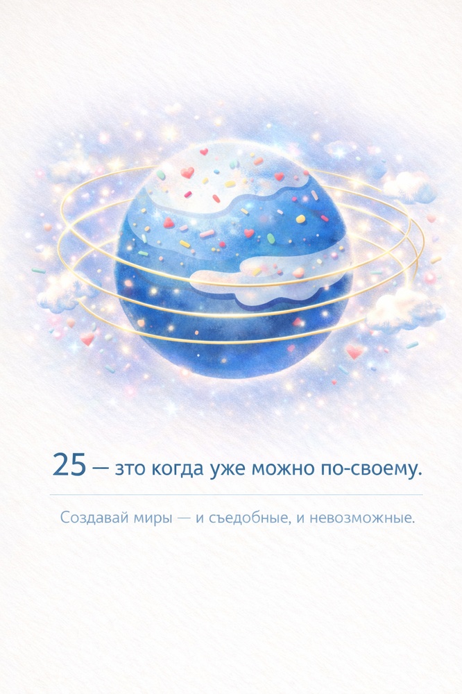 Мы решили заменить дежурное « С Днем Рождения» на слова, которые отсылают к музыке, сладостям или мечтам. Вместе с ИИ собрали: «25 — это когда уже можно по-своему. Создавай миры — и съедобные, и невозможные».