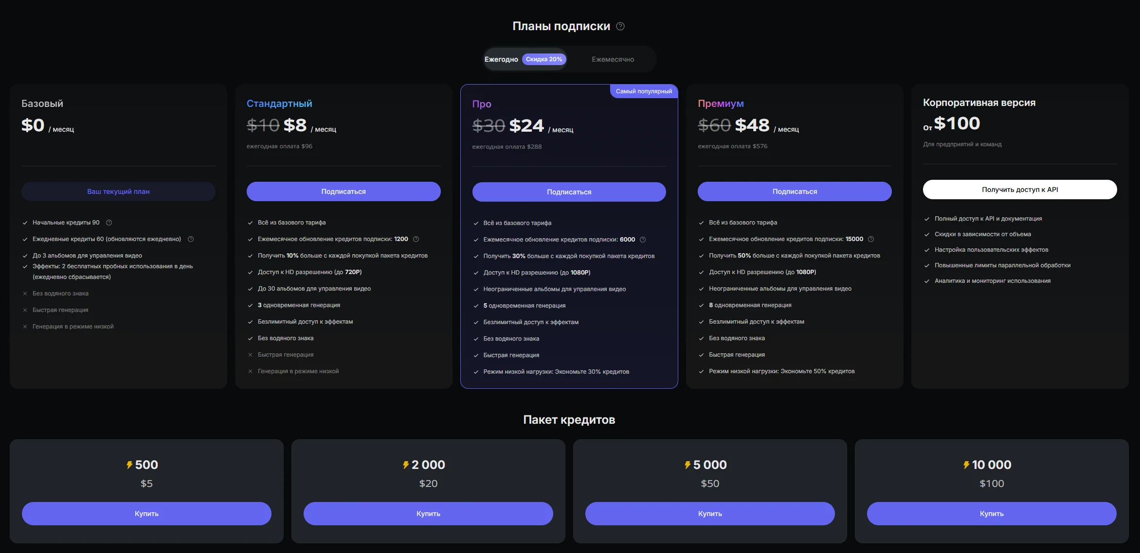 Платные тарифы обойдутся в $8, $24, $48 в месяц. По подписке пользователь получает больше токенов, возможность добавлять альбомы, создавать ролики в лучшем качестве и без водяного знака. Еще можно купить токены отдельно, но так они стоят дороже, чем по подписке. План в таком случае останется базовым, а значит, дополнительных функций вы не получите.