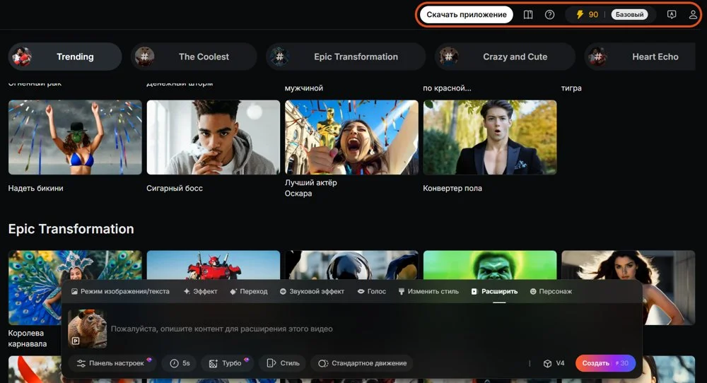 Расширить. Создает продолжение выбранного ролика по текстовому промпту.