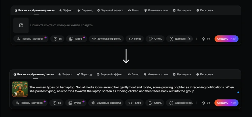 - Скорость работы. Видео генерируется за 5–10 секунд. Это особенно удобно, если нужно быстро сделать контент.
