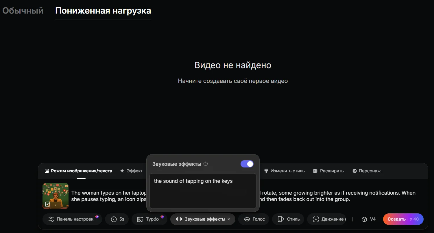 За некоторые настройки сервис списывает больше токенов. Например, за длительность 8 секунд добавляет еще 20 токенов, а за звук — 10 токенов.