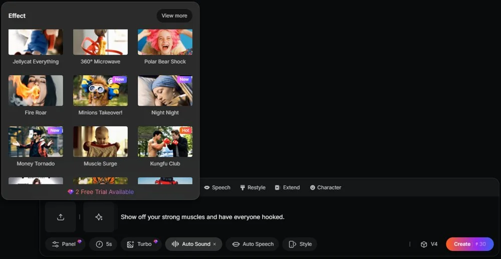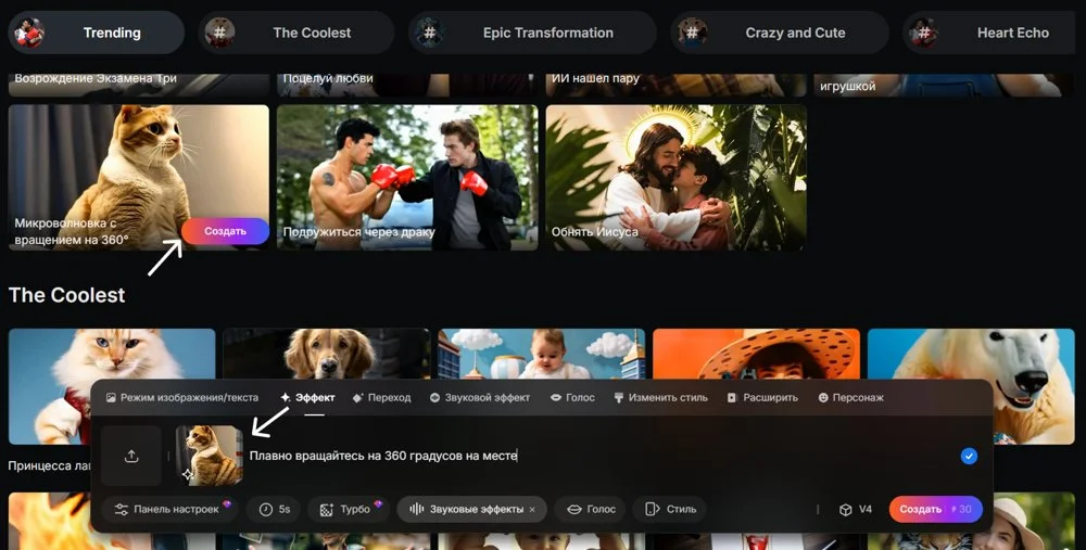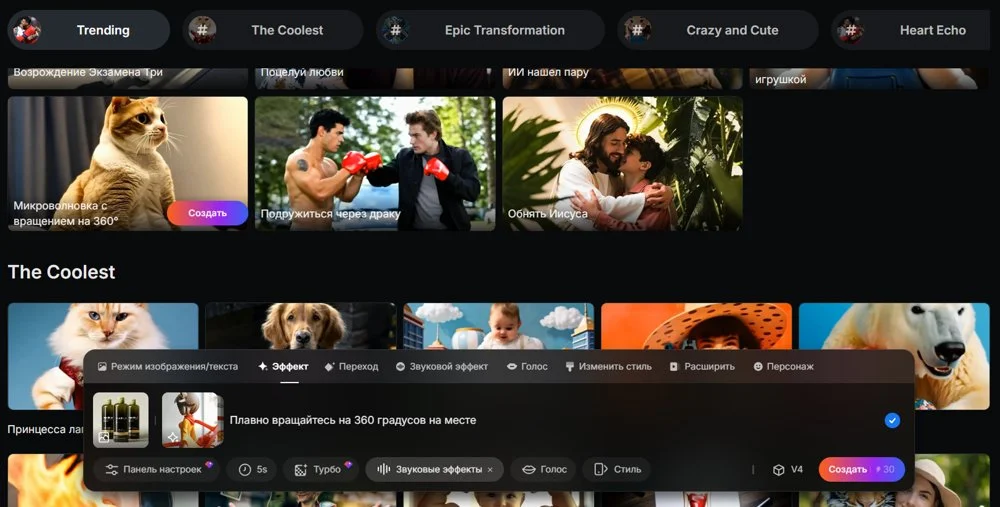 В разделе «Эффекты» собраны шаблоны для видео. Можно выбрать любой и создать по нему ролик — так не нужно самому придумывать промпт и подбирать настройки.