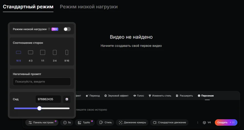 - Панель настроек. Можно выбрать соотношение сторон и ввести негативный промпт — то, чего не должно быть на видео. Еще можно скопировать сид и добавлять его в другие генерации — так стиль всех видео будет примерно одинаковый даже при использовании разных промптов.