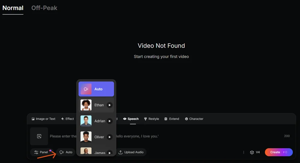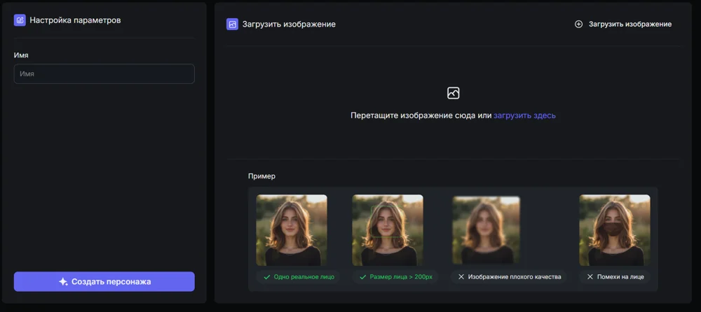 Персонаж. Генерирует несколько роликов с одним и тем же персонажем. Можно создать его в нейросети или загрузить фото в панели создания.