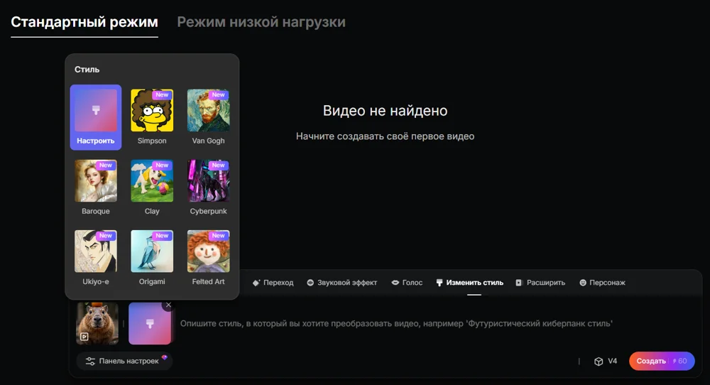 Изменить стиль. Полностью перерисует видео в другом стиле. Его можно выбрать из готовых шаблонов или настроить самостоятельно. Чтобы создать свой, нажмите «настроить» в каталоге и опишите текстом, что хотите получить.