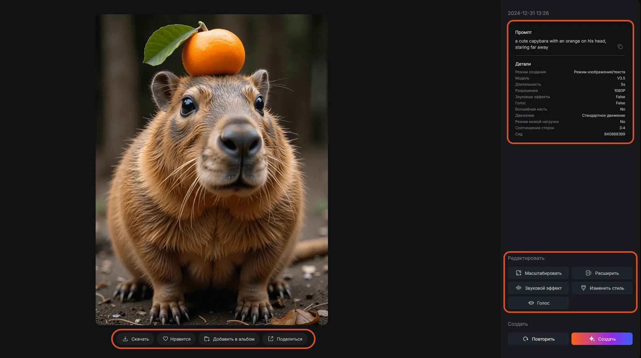 Ленту можно найти на странице «Исследовать». Любое видео можно открыть по левому клику мыши и посмотреть информацию о нем. Под роликом — кнопки «Скачать», «Нравится», «Добавить в альбом», «Поделиться». На панели справа — промпт, детали настройки видео и инструменты редактирования: