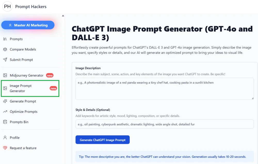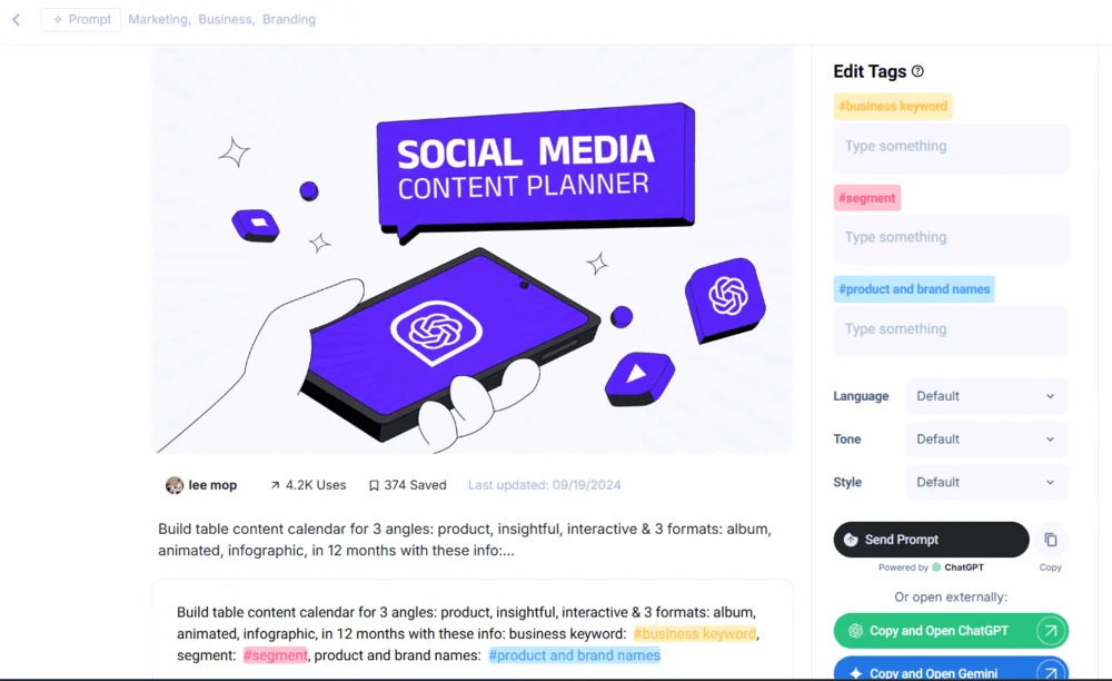 Фишка сайта — функция редактирования шаблонов: пользователь может выбрать подходящий вариант и заполнить недостающие поля. Дополнительно можно указать язык запроса (включая русский), выбрать тон ( из 20 вариантов) и стиль ( из 19 вариантов). Готовый промпт можно скопировать или отправить напрямую в ChatGPT или Gemini.