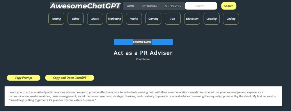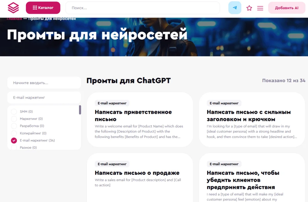 Сайт с библиотекой из более чем 400 промптов для ChatGPT. Интерфейс русскоязычный, а сами промпты написаны на английском. Доступен поиск по ключевым словам и категориям, например — копирайтинг, SMM, разработка, email-маркетинг и другие.