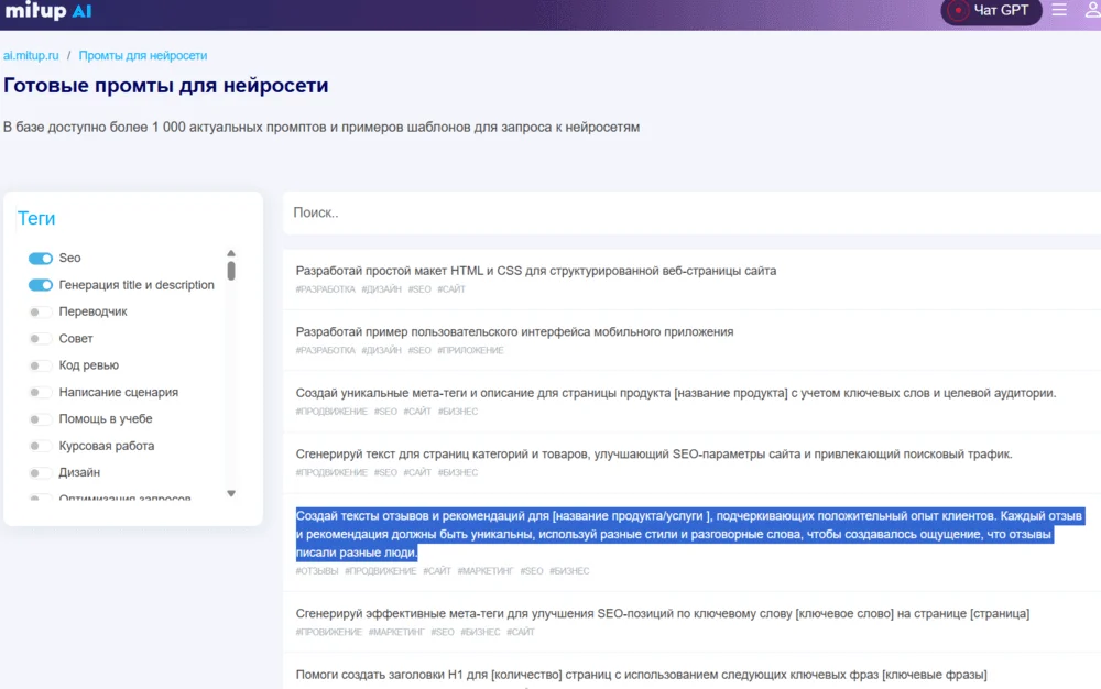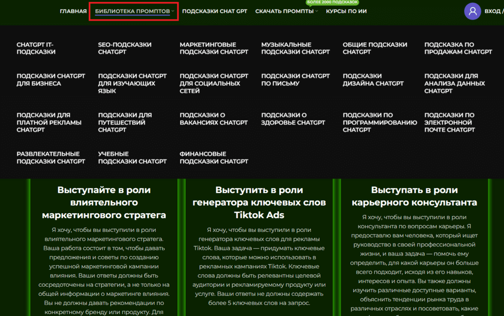 Библиотека промптов для чат-ботов с подробными описаниями на русском языке. Поиска по ключевым словам нет, но есть навигация по категориям. Чтобы открыть промпты, нужно навести курсор на пункт «Библиотека промптов» в верхнем меню. После выбора категории можно найти нужную задачу и нажать «подробнее», чтобы посмотреть текст промпта.