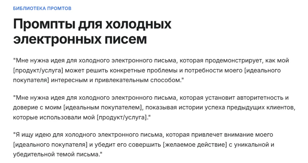 Коллекция промптов под маркетинговые и контентные задачи. Все шаблоны составлены на русском языке. Есть категории для блога, YouTube, «холодных» сообщений, рассылок, сториз и копирайтинга. Также представлены промпты с описанием ролей, включая задачи, связанные с программированием.