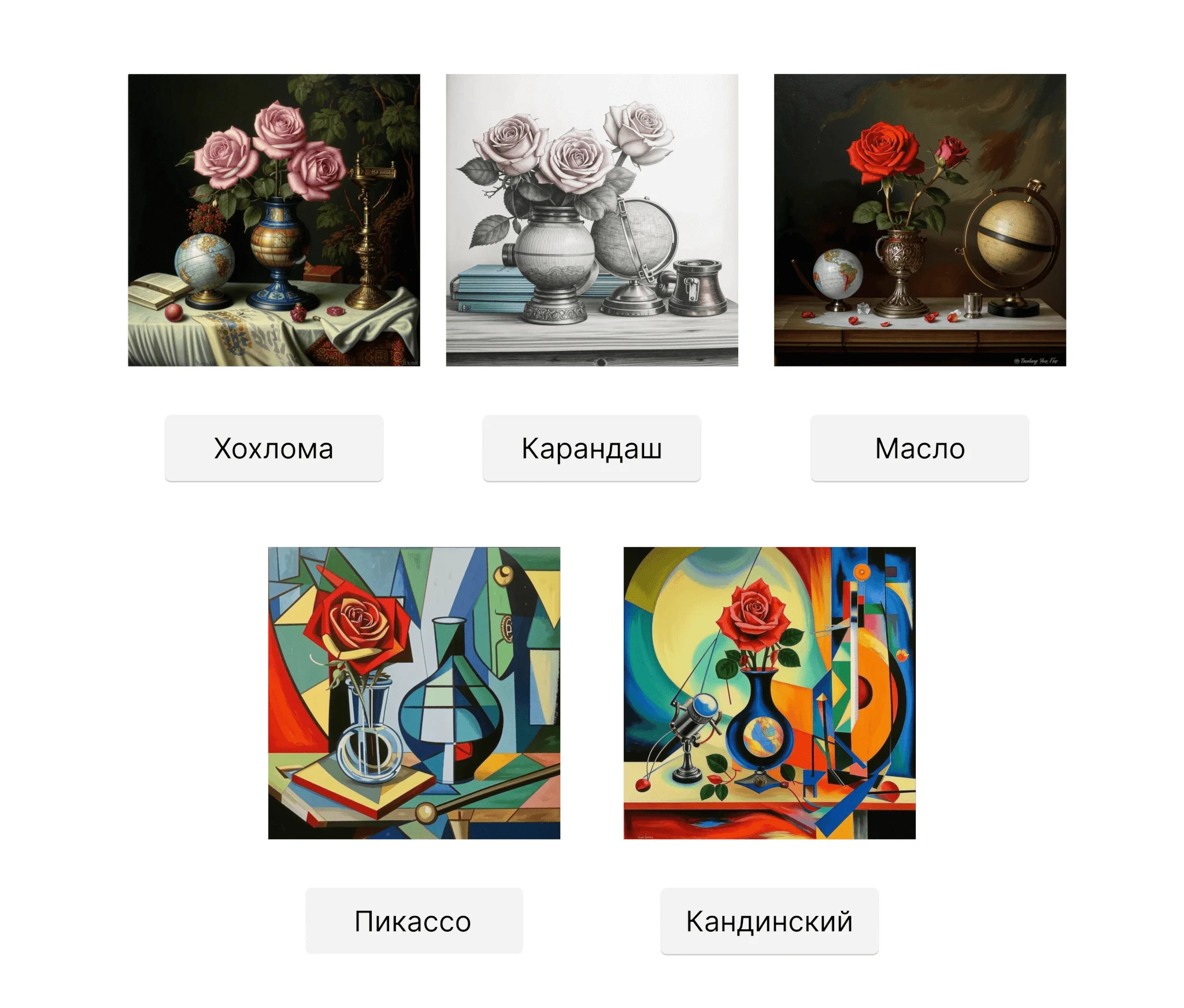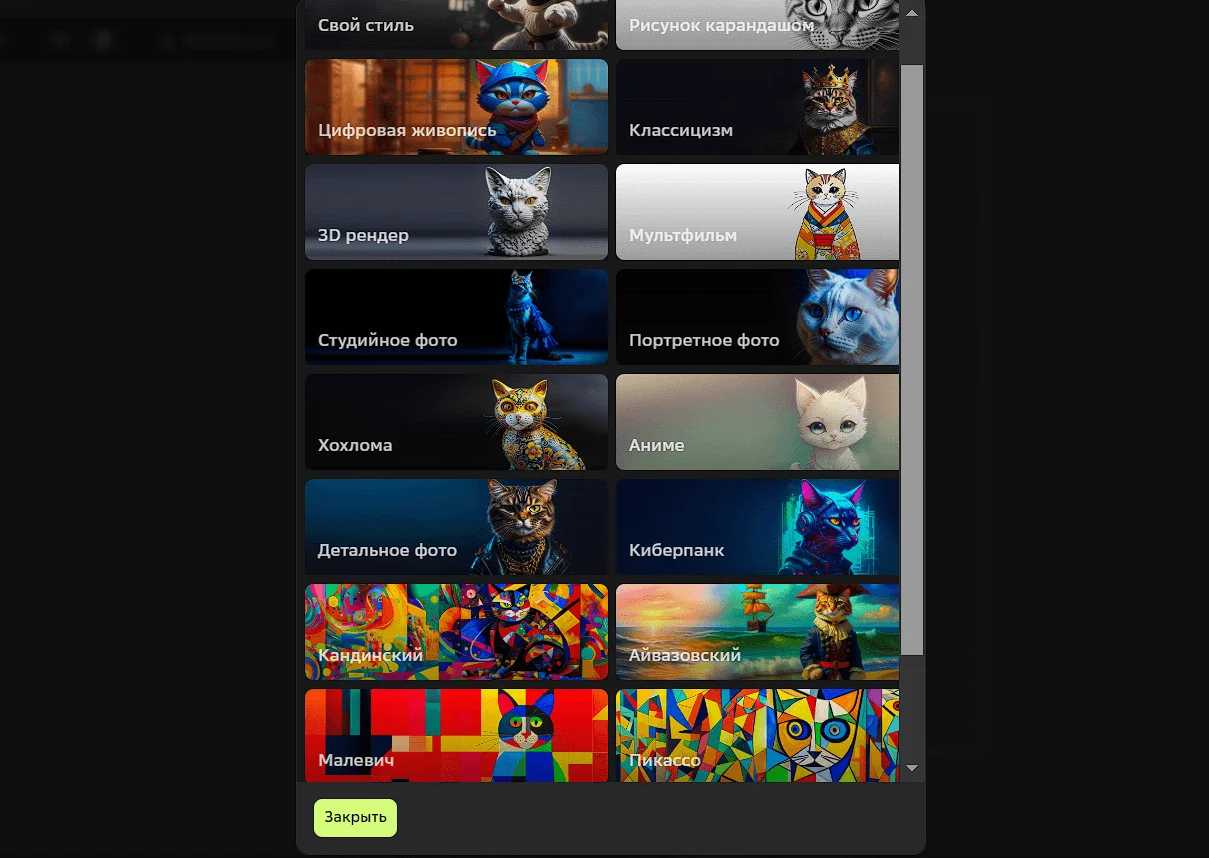 Стиль. Это общий дизайн работы — уникальный или копирующий великих мастеров. Можно выбрать один из 18 вариантов, в том числе аниме, 3D-рендер, масляная живопись или пиксель-арт. Разработчики периодически добавляют новые дизайны и убирают неактуальные — так было с «Новым Годом». К каждому стилю есть готовый пример с котиком.
