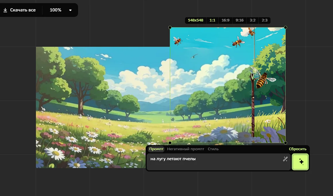 Область генерации. Если создать картинку по промпту, а потом передвинуть рамку — можно доработать изображение. Мы сначала выбрали пустой луг, а затем добавили на него пчел.