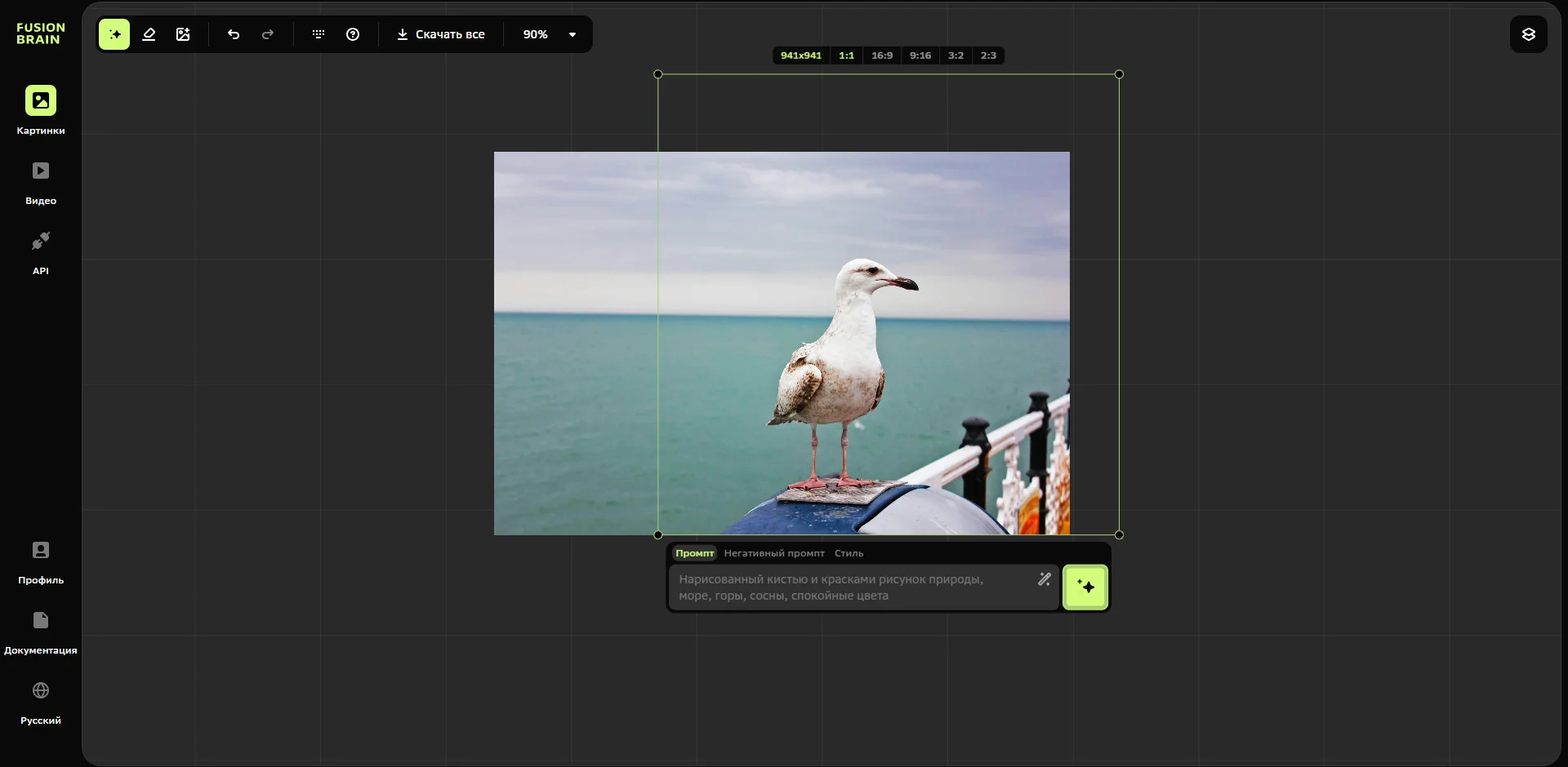 Сайт Fusion Brain. Здесь доступно больше всего инструментов. Можно генерировать и дорабатывать картинки в разных стилях и размерах, создавать видео, гифки. Сервис просит предварительную регистрацию.