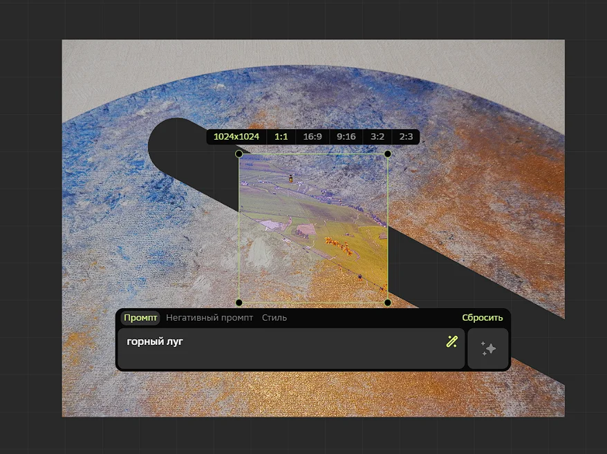 Ластик. С ним можно стереть лишнюю деталь или «замазать» это место с помощью промпта. Мы взяли фотографию с абстрактной живописью и просто провели ластиком полоску. Затем расположили область для генерации поверх кадра и получили заполнение.