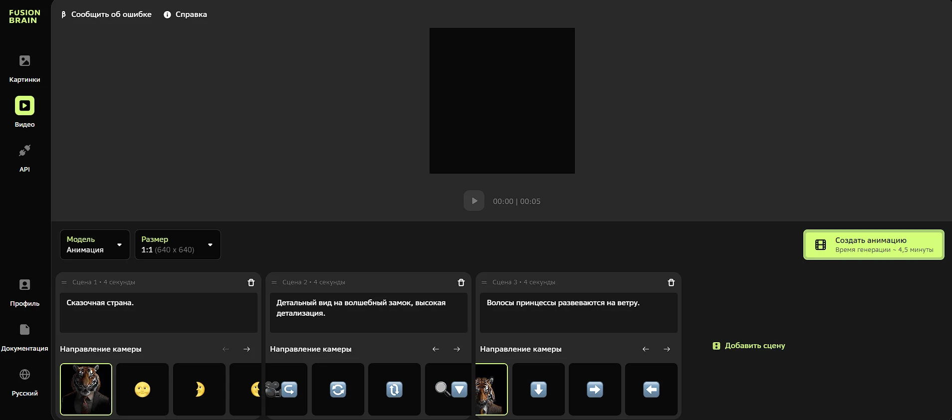 Направление камеры. На вкладке «Видео» в режиме анимации можно выбрать поворот для каждой сцены. Варианты отображаются в виде эмодзи с луной и стрелок, а при наведении появляется референс — тигр в пиджаке. В режиме видео такой функции нет — только ввод промпта.