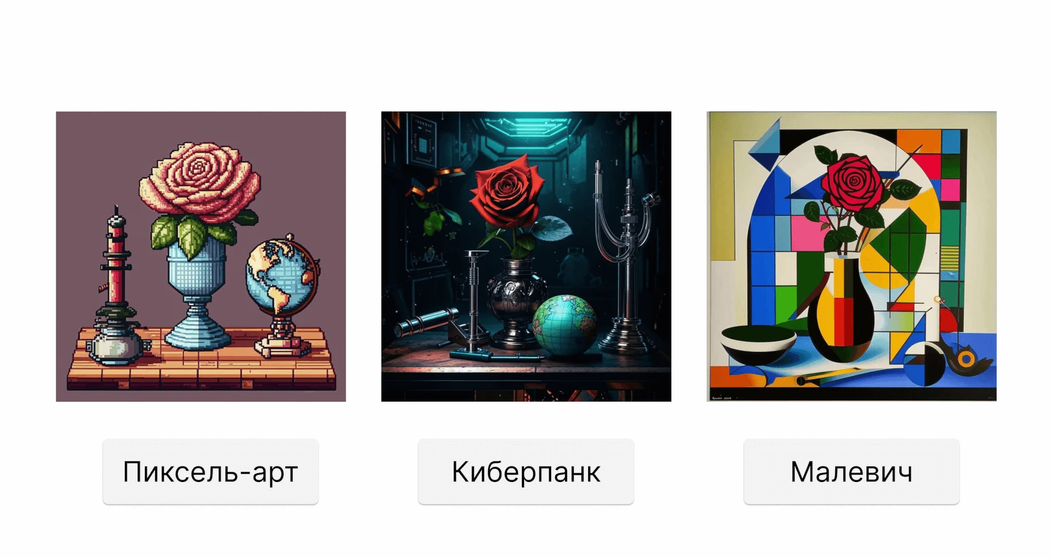 Kandinsky не обязательно использовать только для маркетинговых задач — в нем можно сгенерировать аватарку или открытку. Для этого хорошо подойдет тот же пиксельный стиль или рисунок карандашом, масляная живопись, хохлома.