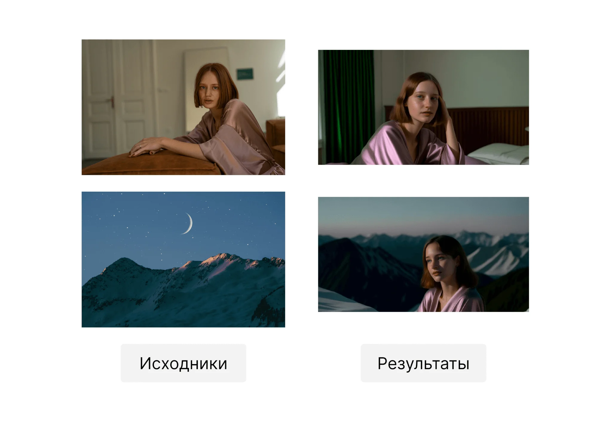 Представим, что мы провели фотосессию для рекламы пижам. А затем решили доработать ее — изменить атмосферу фото и образ модели, добавив горный пейзаж. Для этого попросим оставить 70% от исходного кадра и 30% от того, по которому будем изменять. В результате у одежды девушки как будто появился блеск. При варианте 50/50 она уже отправилась в «путешествие» — изменился ракурс, фон и акценты.
