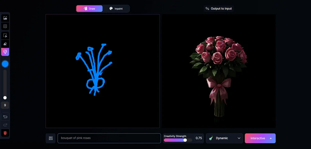Холст в режиме реального времени (Realtime Canvas). Функция позволяет создавать картинки с нуля или редактировать существующие. В первом случае нужно нарисовать скетч в соответствующем окошке, дополнить его промптом, и нейросеть сгенерирует изображение. Для редактирования иллюстрации нужно загрузить референс и воспользоваться следующими инструментами: кисть, выделение, фильтры, эффекты и т. д. Все изменения проходят в режиме реального времени.