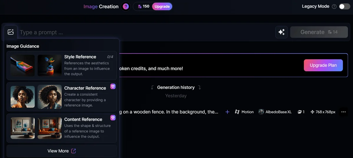 Если в строке для ввода промпта нажать кнопку с иконкой картинки, откроются дополнительные возможности для генерации артов. Например, Style Reference позволяет скопировать эстетику любого загруженного фото и не возиться с написанием промпта. Функция Character Reference поможет генерировать одного и того же персонажа в разных позах, одеждах, локациях. Для этого нужно загрузить изображение героя. Эта опция доступна только на платной подписке.