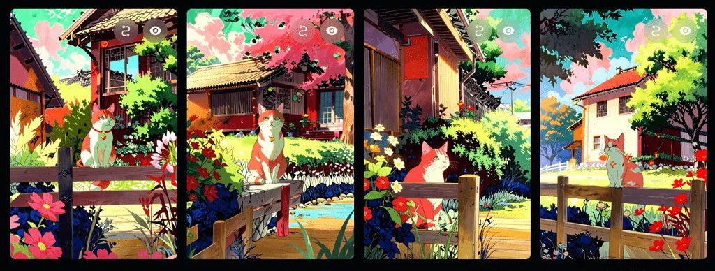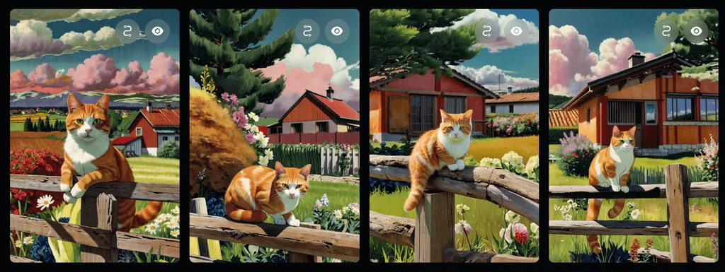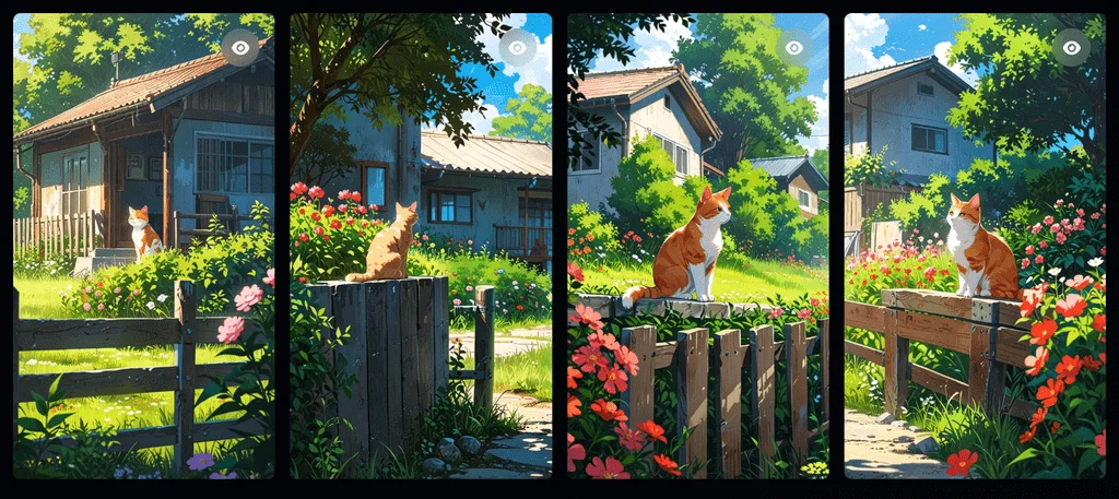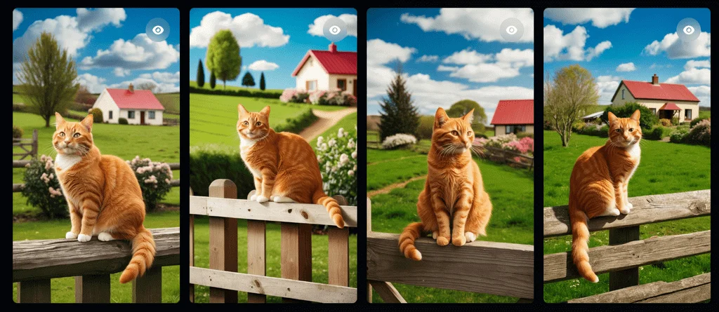 Для примера будем использовать такой промпт: A cozy rural scene with a bright ginger cat sitting on a wooden fence. In the background, there are green fields and a few trees under a blue sky with white clouds. In the distance, a house with a red roof can be seen, surrounded by blooming flowers and bushes. The cat looks content and watches the world around her.