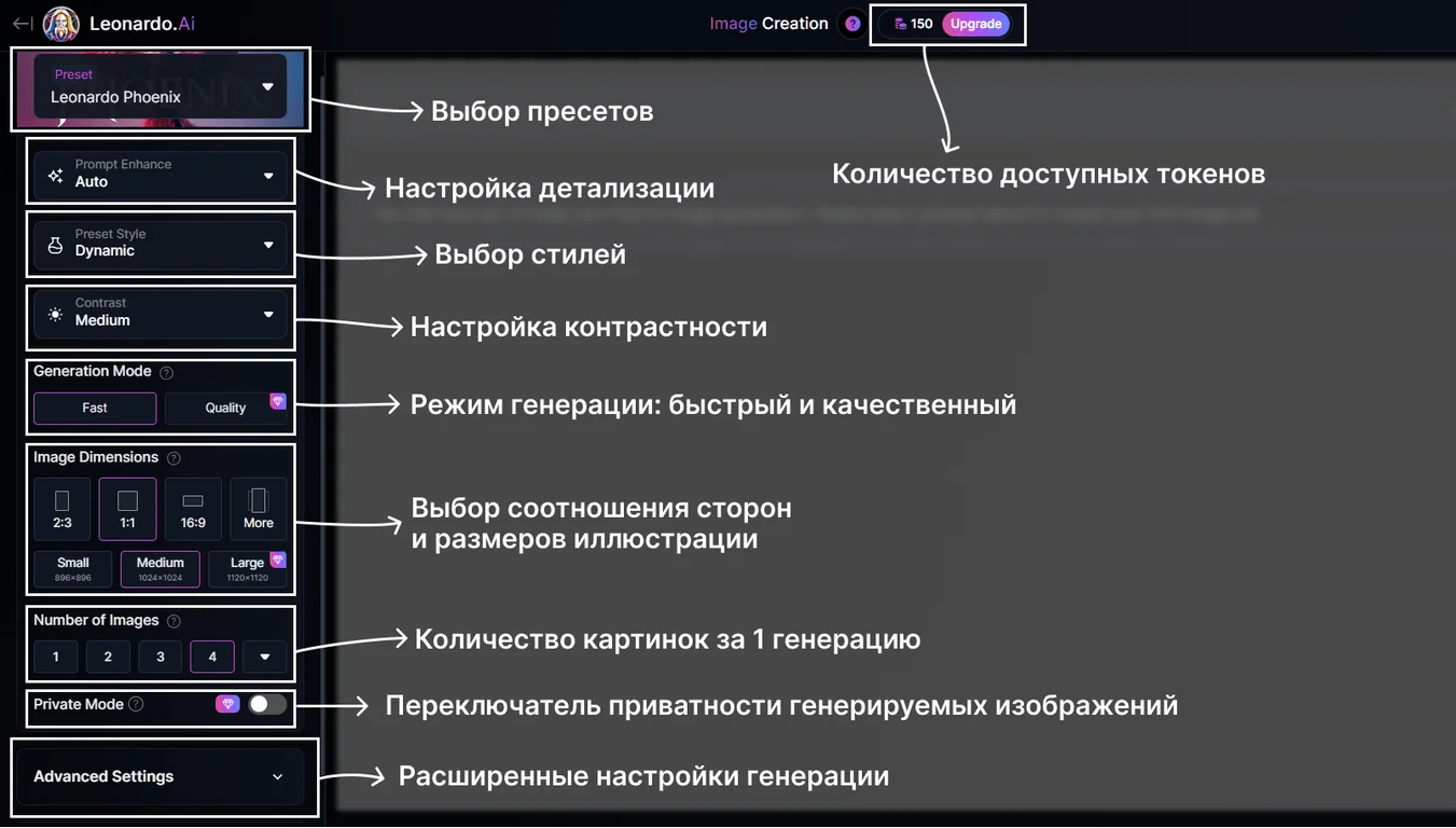 На платформе много настроек для продвинутых: негативные промпты, настройка собственной ИИ-модели, генерация по референсам и т. д.