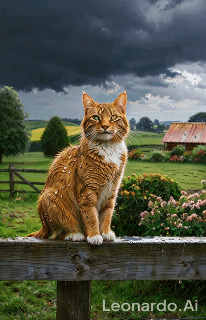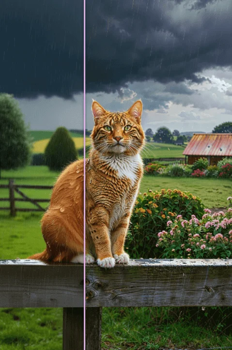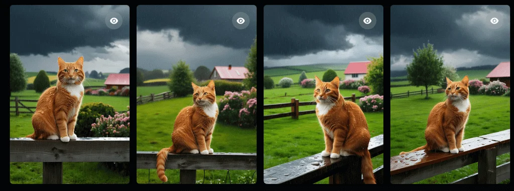 Для примера мы в настройке Edit with AI попросили нейросеть добавить в наш промпт дождливую погоду (add rainy weather). Она переработала запрос и подробно описала в нем новую атмосферу: A cozy rural scene with a bright ginger cat sitting on a wooden fence, water droplets glistening on its fur. In the background, there are green fields and a few trees under a grey-blue sky with dark clouds and rain gently pouring down. The rain creates a misty atmosphere, and the air is fresh and clean. In the distance, a house with a red roof can be seen, surrounded by blooming flowers and bushes that are vibrant despite the rain. The cat looks content and watches the world around her, seemingly enjoying the peacefulness of the rainy day.