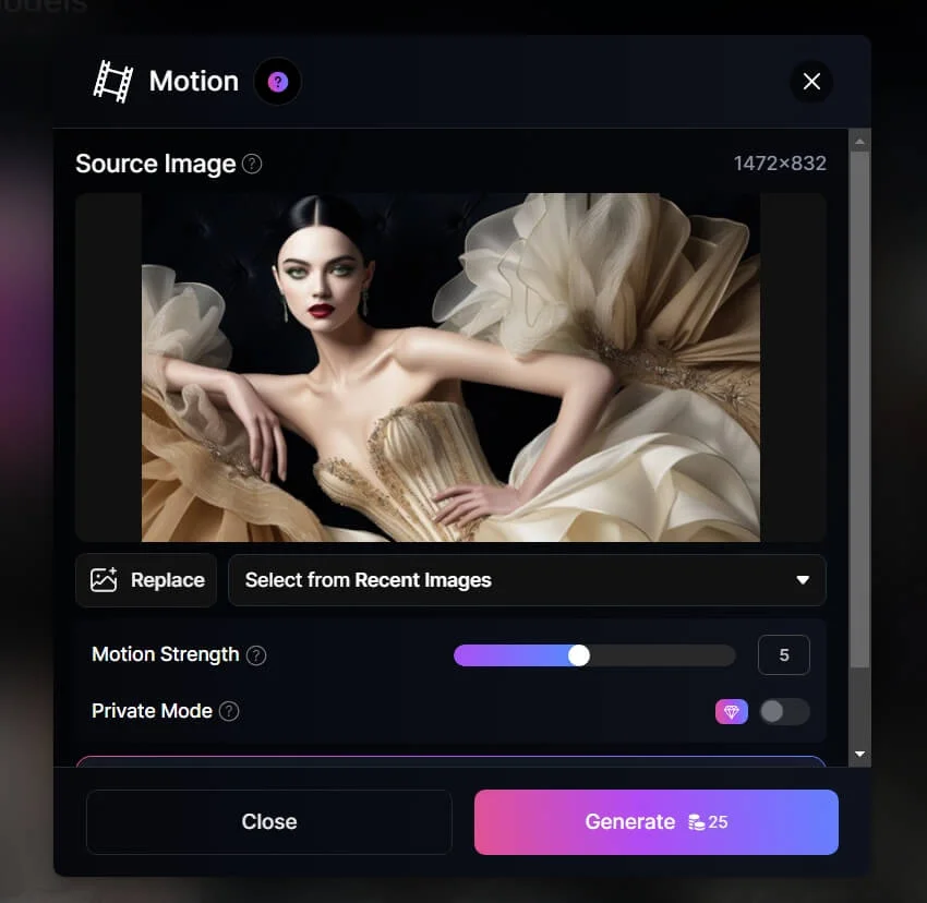 Перейдите в инструмент Motion и добавьте изображение, которое хотите анимировать. Использовать можно только иллюстрации, которые сделаны в Leonardo AI. Если у вас нет сгенерированных картинок, возьмите любое из общей ленты.