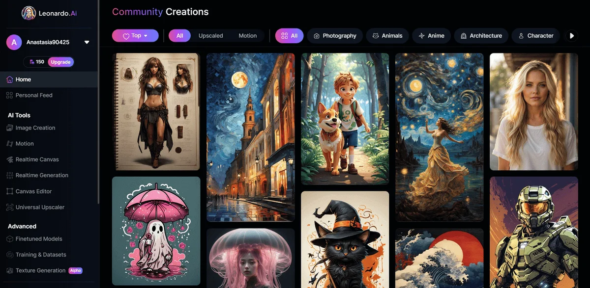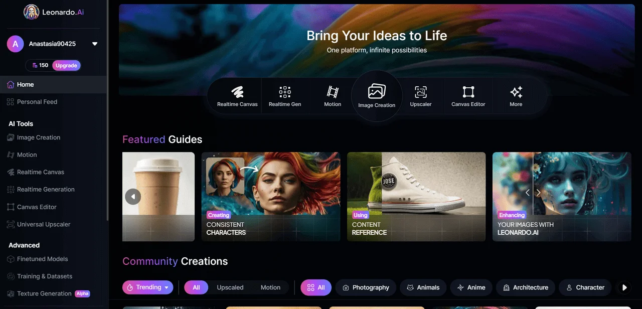Ниже на скриншоте — главный экран Leonardo AI. Слева перечислены все функции нейросети. Основные из них также продублированы по центру. Большинство функций в Leonardo бесплатные, но некоторые доступны только по подписке.