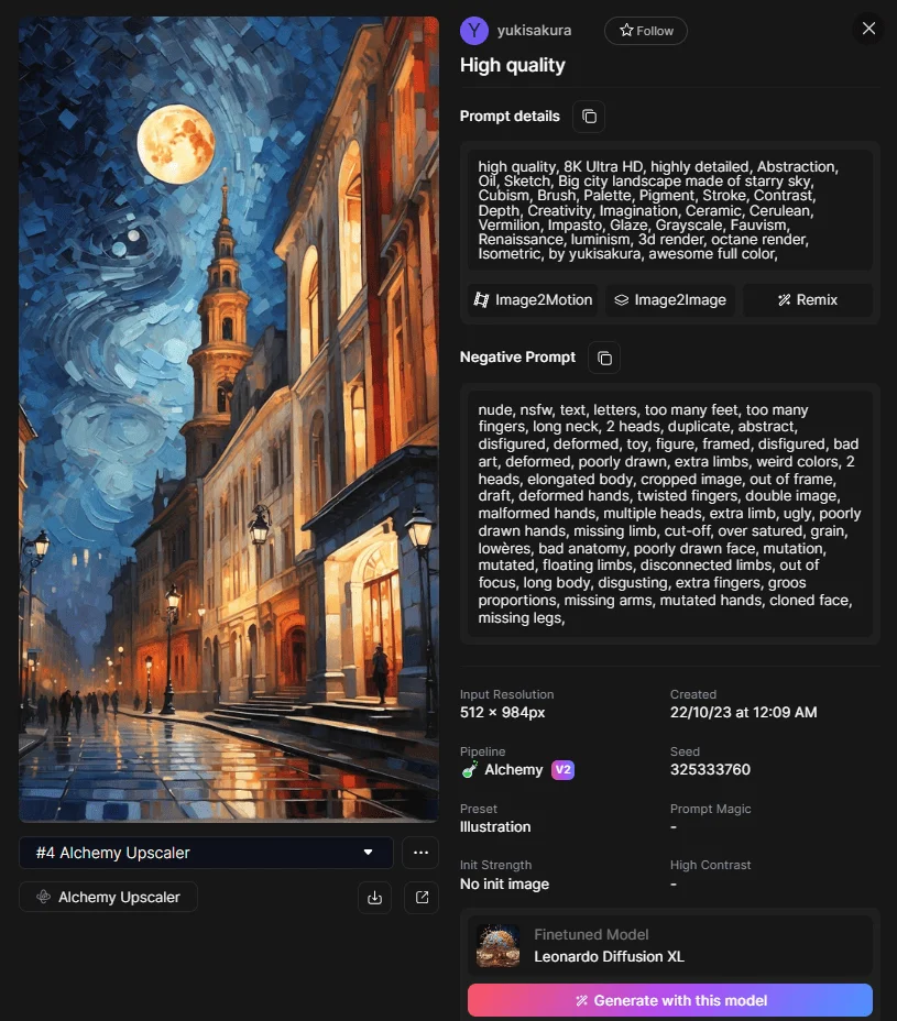 Ниже на главном экране есть изображения, которые сгенерировали другие пользователи. Можно нажать на любое из них и посмотреть промпт с настройками. Картинку можно превратить в анимацию, скачать или сгенерировать на ее основе свою иллюстрацию.