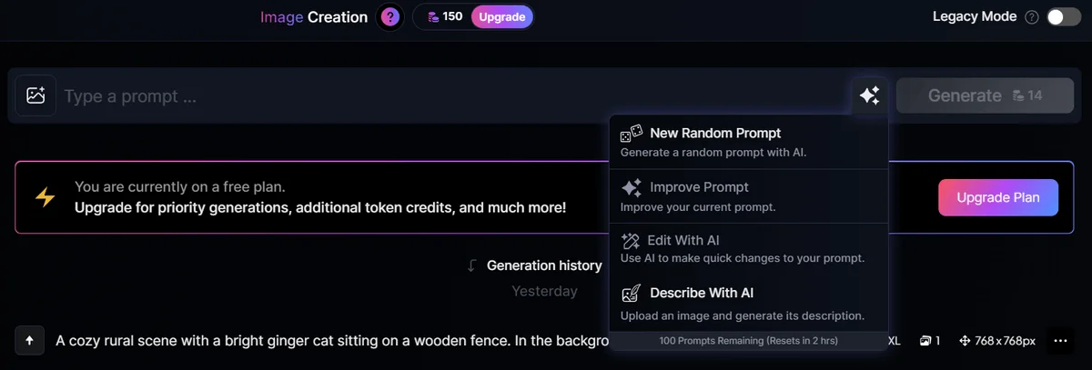 - Improve Prompt (улучшить промпт) — нейросеть расширит короткий запрос, добавит в него детали и описания;