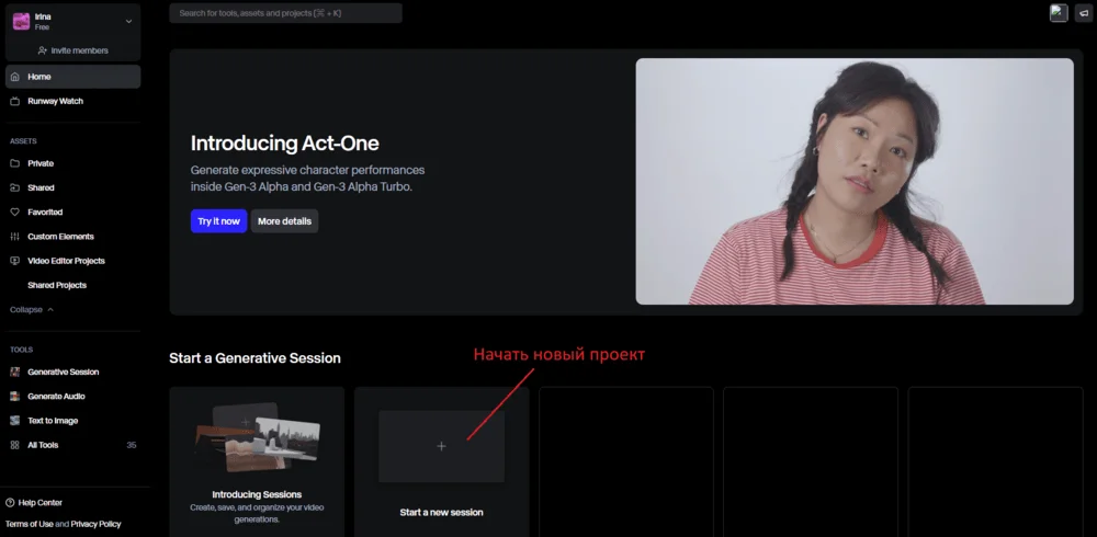 После регистрации попадаем в рабочее пространство, на страницу Home. Чтобы начать генерировать, нужно найти плитку с подписью Start a new session и нажать ее.