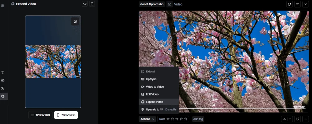 Изменение соотношения сторон видео. Этот инструмент — четвертая иконка. Горизонтальное видео можно сделать вертикальным, и наоборот. Используем видео, которое создали с контролем камеры. Можно скачать и загрузить ролик. Или же — нажать на Actions под сгенерированным видео и выбрать Expand Video.