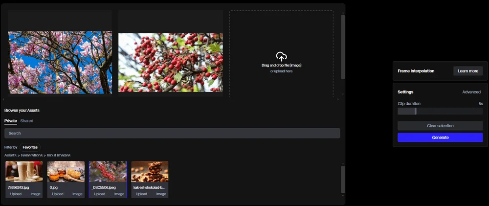 Разберем некоторые функции. Frame Interpolation — это покадровый переход одной картинки в другую, по сути, превращение. Нужно загрузить минимум два изображения и указать длительность видео в окне справа.