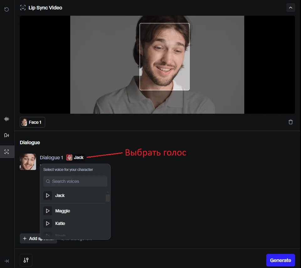 А теперь создадим липсинк. Загружаем стоковое видео, где отчетливо видно лицо мужчины. В поле ниже добавляем одну строчку текста «Привет! Как дела?». В настройках диалога выбираем голос персонажа.
