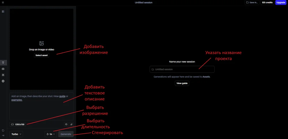 Откроется рабочая страница. На панели слева — поле для добавления файлов. Загружаем или перетаскиваем референсное изображение → в поле ниже можем описать добавленный файл (опционально, но так нейросети будет проще разобрать суть картинки) → настраиваем разрешение: 1280х768 или 768х1280 → устанавливаем длительность: 5 или 10 секунд.