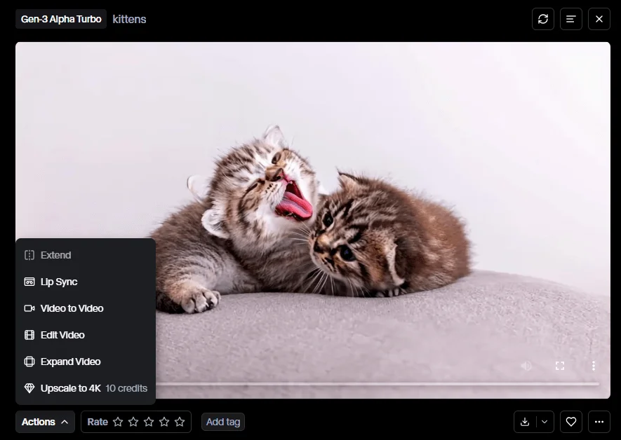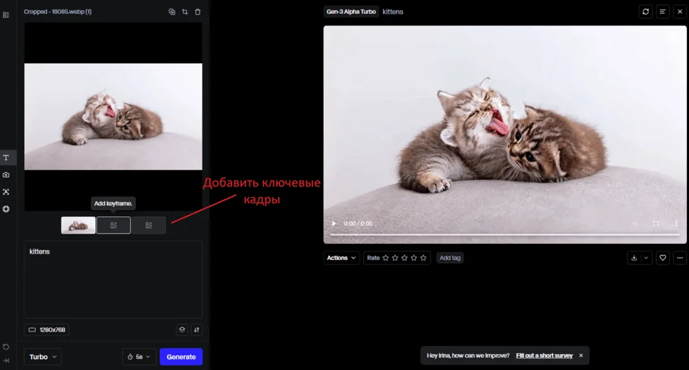 Для примера возьмем стоковую картинку с котятами. Загружаем ее, делаем подпись kittens и генерируем со стандартными параметрами. Создание 5-секундного видео стоит 25 кредитов. Результат: