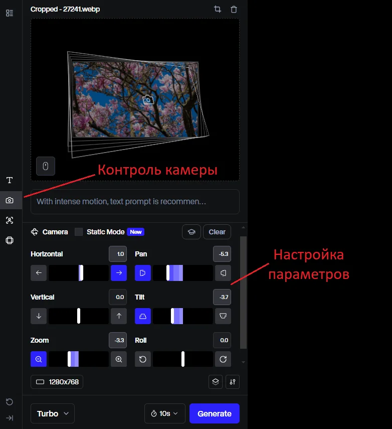 - Gen-3 Alpha Turbo — упрощенная версия, позволяющая генерировать видео только по картинке. Работает быстрее остальных.