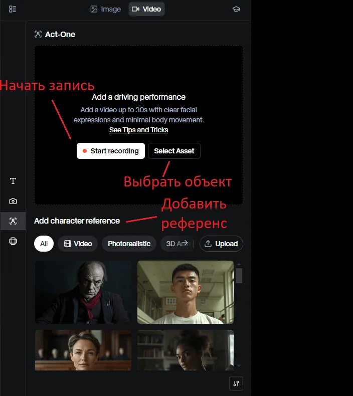 Для доступа к функции нужно нажать на третью иконку на панели инструментов. Далее нужно загрузить видео или сделать запись с камеры. Чтобы задать стилистику генерируемому ролику, добавляем референс: из готового каталога или свой. Это может быть персонаж фильма, мультика или любой нарисованный герой.