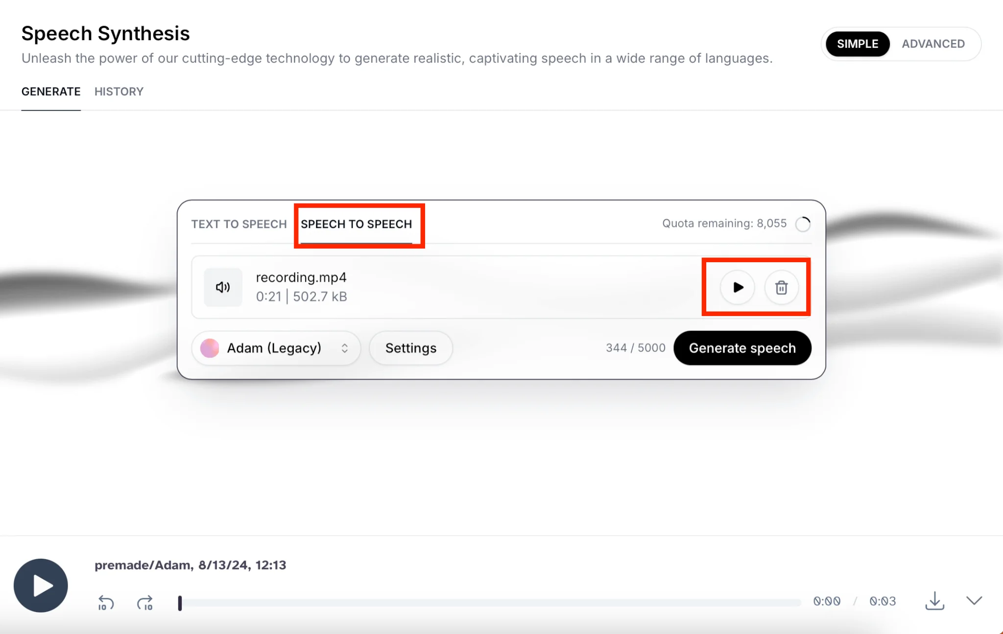 «Speech to Speech» (Изменение голоса). Функция работает аналогично, только вместо текста вы загружаете либо записываете аудио и нажимаете на «Generate speech». Для прослушивания своей записи нажмите «Play», для удаления — на значок корзины.