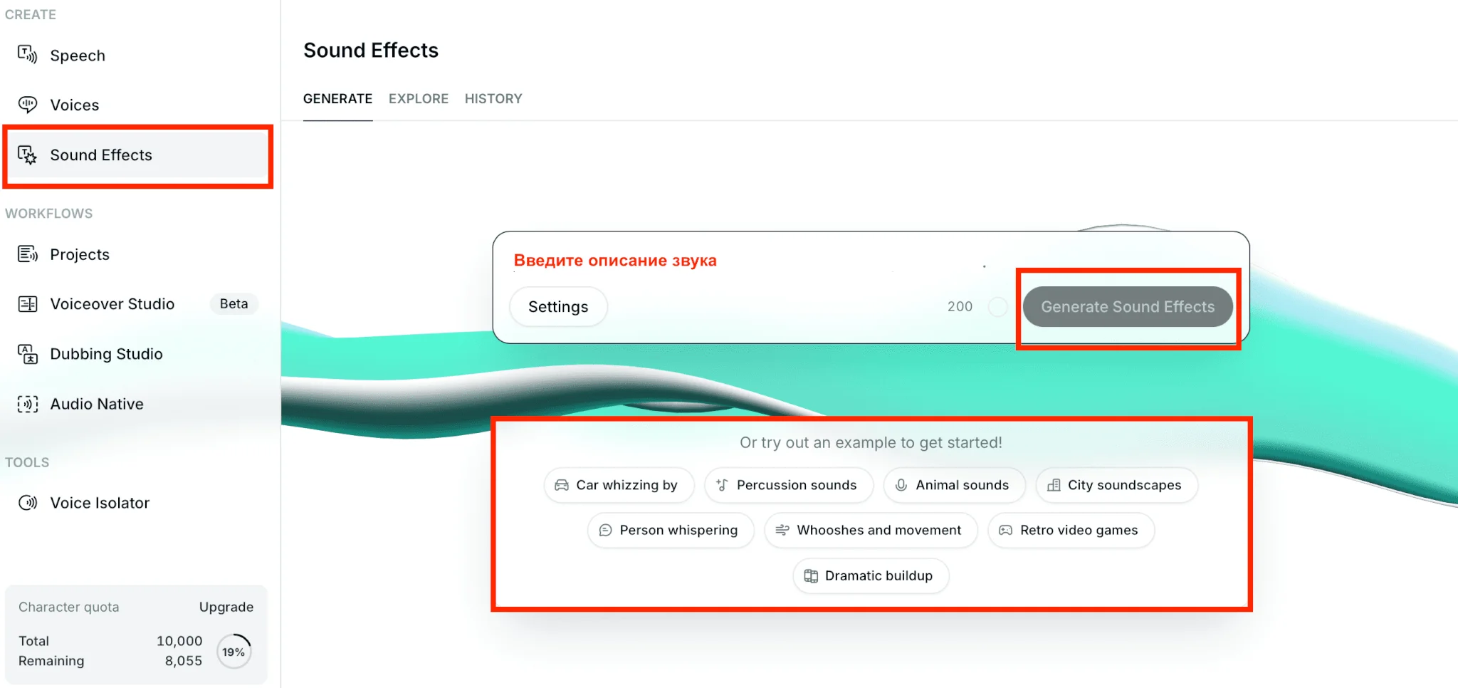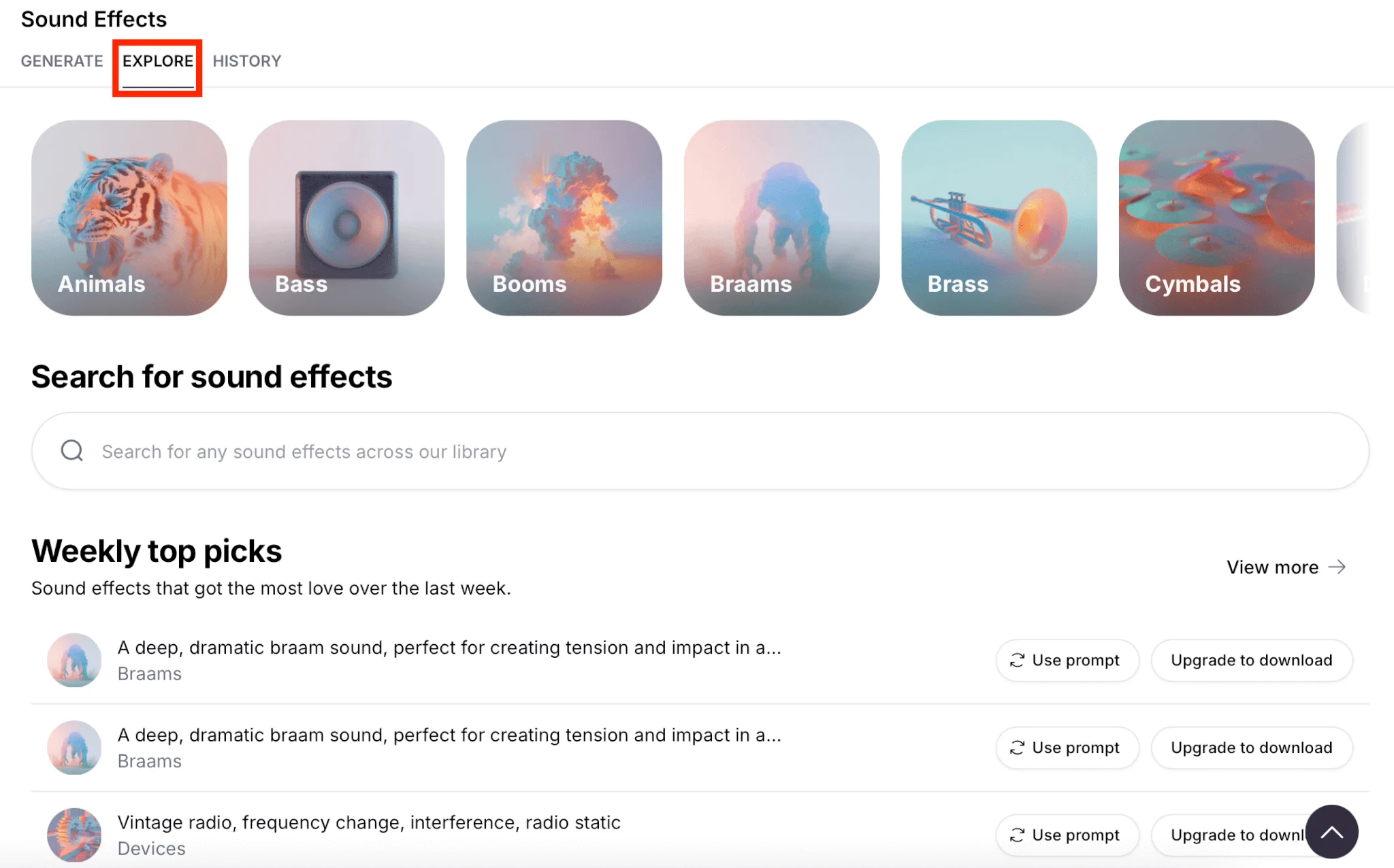 Больше готовых промптов есть в разделе «Explore». В библиотеке есть звуки животных, механизмов, музыкальных инструментов.