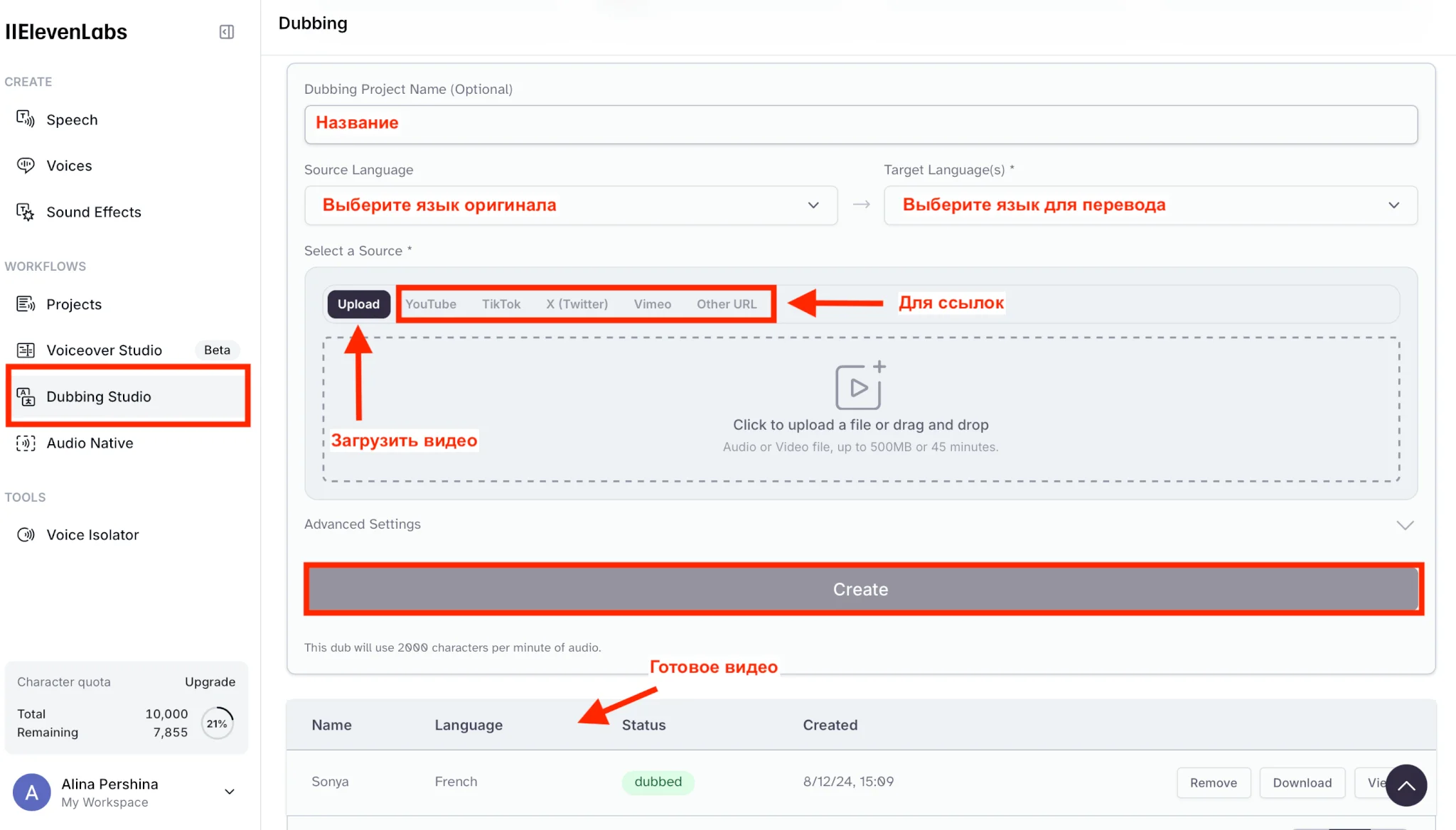 «Dubbing studio» (Перевод). Загрузите видео или аудио весом до 500 МБ и длительностью до 45 минут или вставьте ссылку с любого из представленных ресурсов, дайте название, выберите язык перевода. Как все настроите, нажмите «Create». Файл с переводом появится внизу экрана.