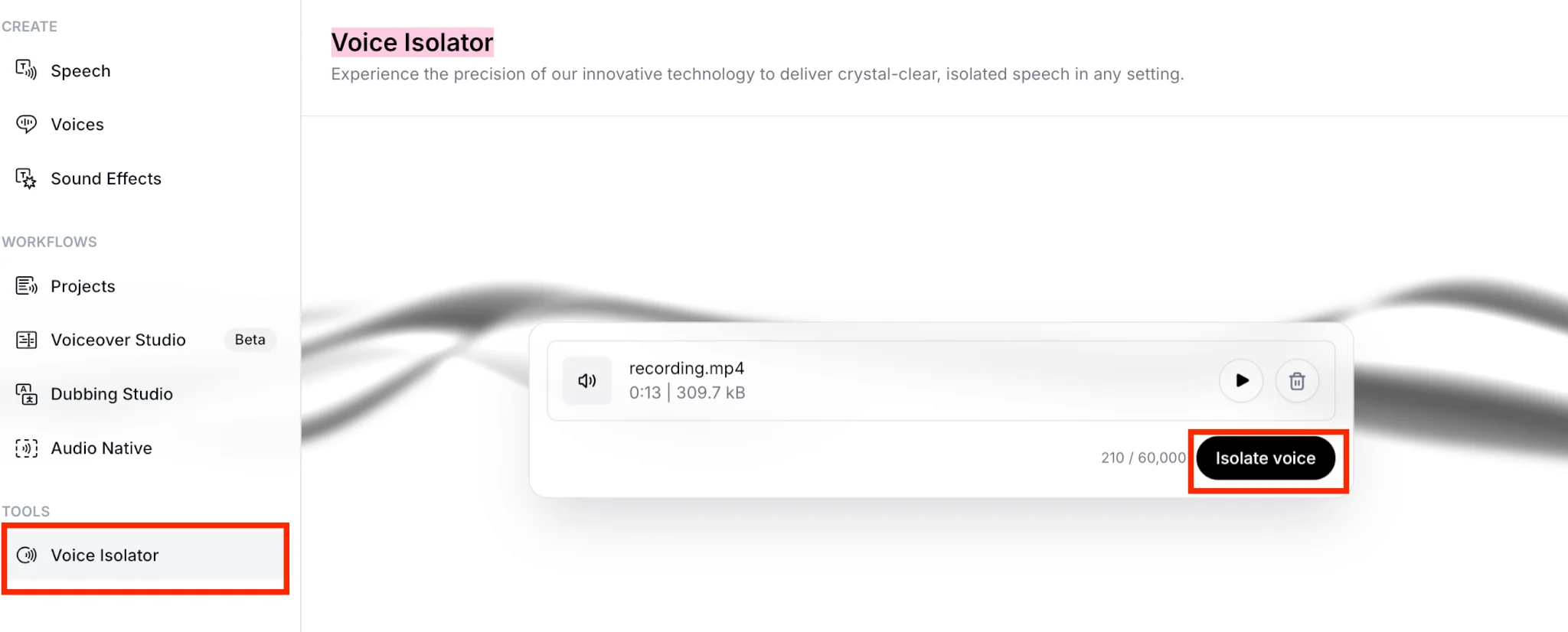 «Voice Isolator» (Удаление шумов с фона). Загрузите или запишите аудио до 500 МБ и нажмите «Isolate voice».