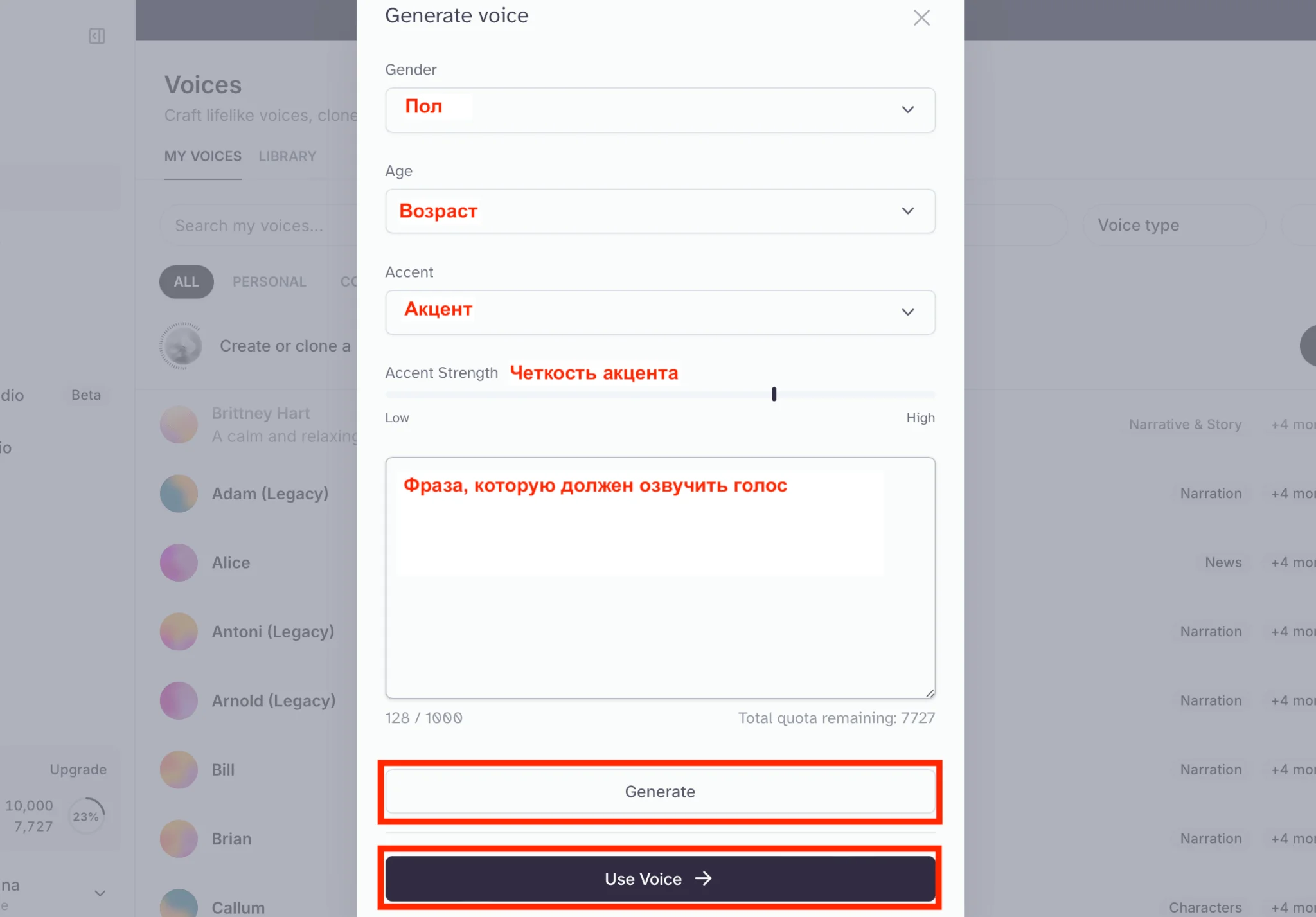 Выберите пол, возраст, акцент и насколько сильно этот акцент проявляется в голосе. Сгенерировать можно только голос на английском, поэтому на выбор 5 акцентов: английский, американский, австралийский, африканский и индийский.