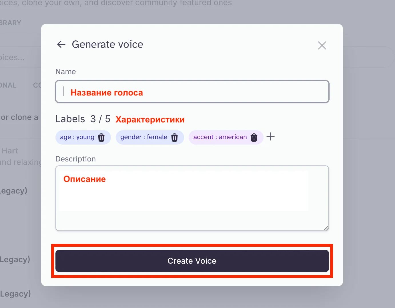 Дайте название созданному голосу, добавьте описание и характеристики, например, акцент или возраст. Нажмите «Create Voice».
